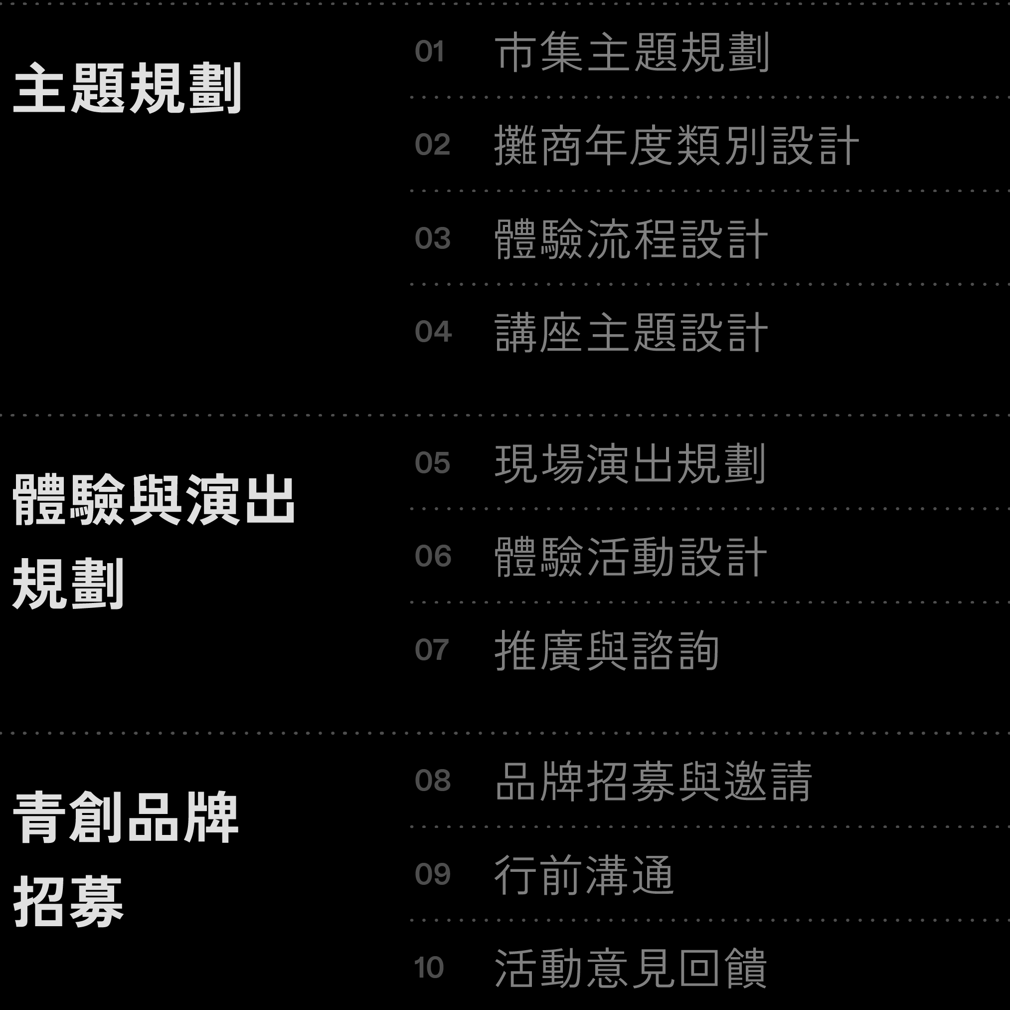 整體內容涵蓋策劃活動主題、體驗及演出、視覺設計與空間規劃⋯⋯等相關子項目。在內容架構建立後,團隊連續兩年在不同工作範疇皆有固定計劃作為依循,並在活動執行後得以完成相對應的效益評估。